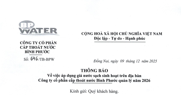 Thông Báo Về việc áp dụng giá nước sạch sinh hoạt trên địa bàn Công ty cổ phần cấp thoát nước Bình Phước quản lý năm 2026