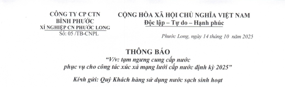 Thông Báo tạm ngưng cung cấp nước phục vụ cho công tác xúc xả mạng lưới cấp nước định kỳ 2025 - Xí nghiệp Cấp Nước Phước Long