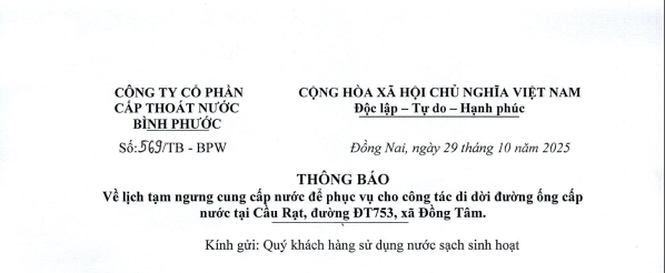 Để phục vụ cho việc đi dời đường ống cấp nước tại Cầu Rạt, đường ĐT753, xã Đồng Tâm, tỉnh Đồng Nai. Nay công ty cổ phần cấp thoát nước Bình Phước xin thông báo đến Quý khách hàng sử dụng nước lịch tạm ngưng cung cấp nước cụ thể như sau: