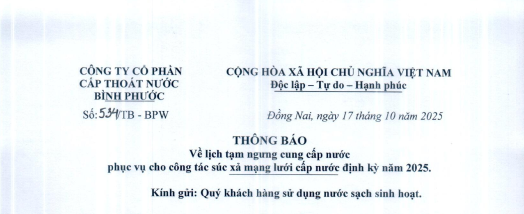 Công ty cổ phần cấp thoát nước Bình Phước xin thông báo đến Quý khách hàng được biết để có kế hoạch dự trữ nước phục vụ sinh hoạt và sản xuất trong thời gian Công ty tạm ngưng cung cấp nước. Rất mong nhận được sự thông cảm và chia sẻ của quý khách hàng.
