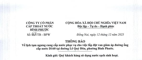 Thông Báo Về lịch tạm ngưng cung cấp nước phục vụ cho việc lắp đặt van giảm áp đường ống cấp nước D160 tại đường Lê Quý Đôn, phường Bình Phước