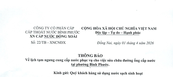 Thông Báo Về lịch tạm ngưng cung cấp nước phục vụ cho việc đấu nối đường ống cấp nước tại đường Số 1, KCN Đồng Xoài 1, phường Đồng Xoài
