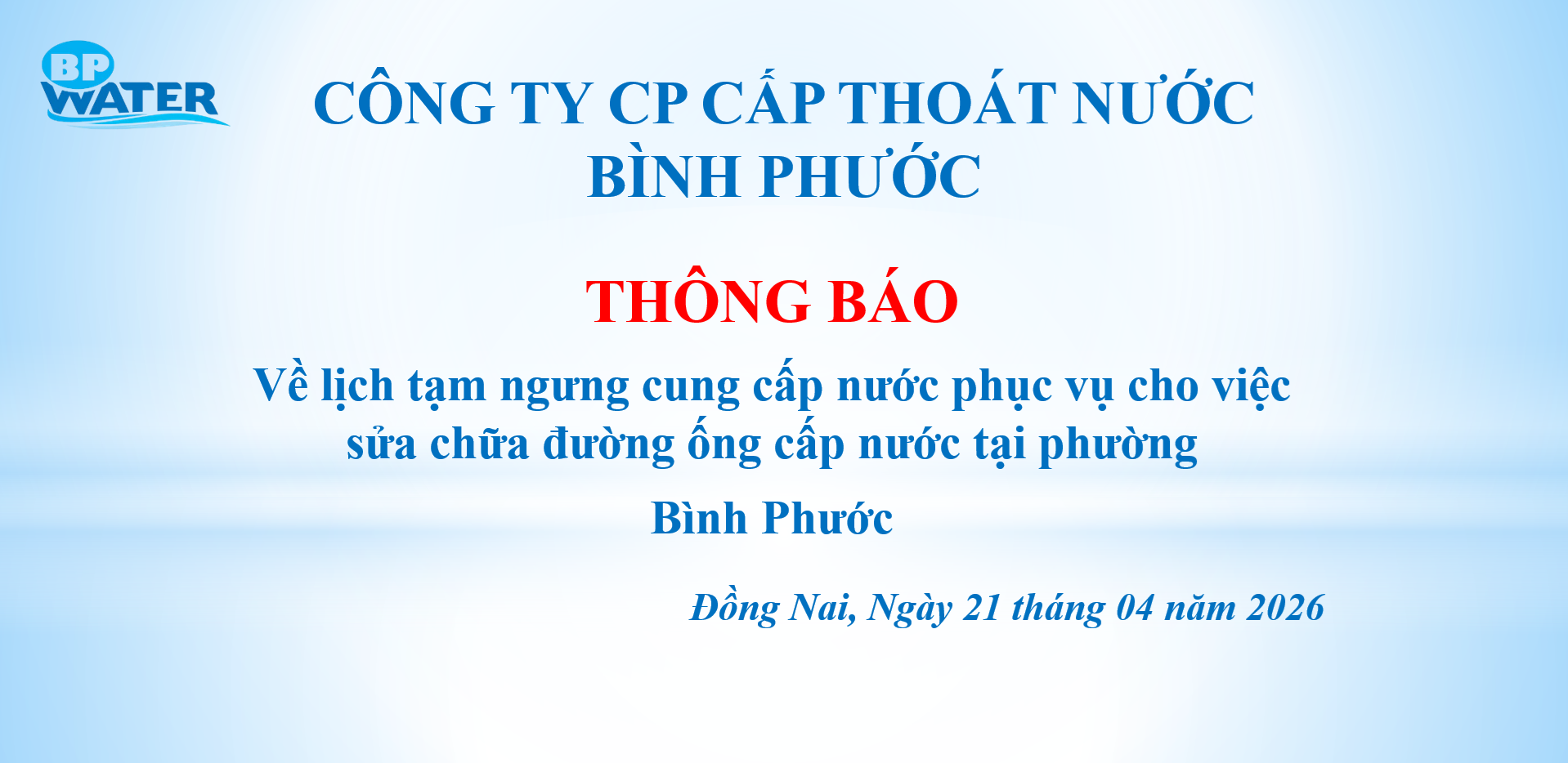 Thông Báo Về lịch tạm ngưng cung cấp nước phục vụ cho việc sửa chữa đường ống cấp nước tại phường Bình Phước